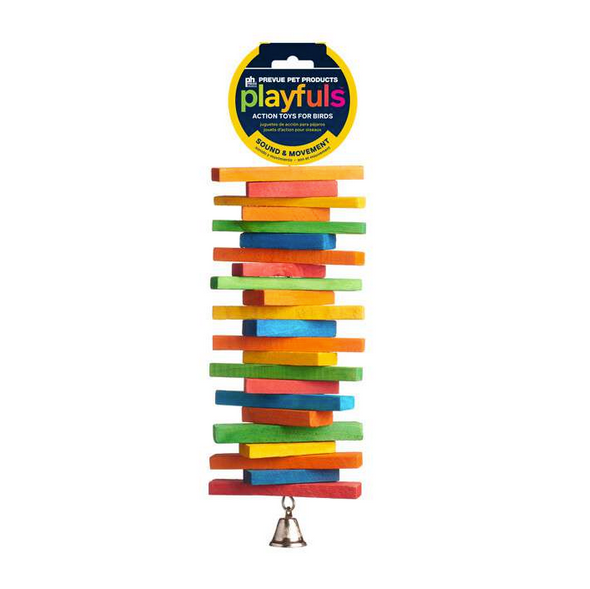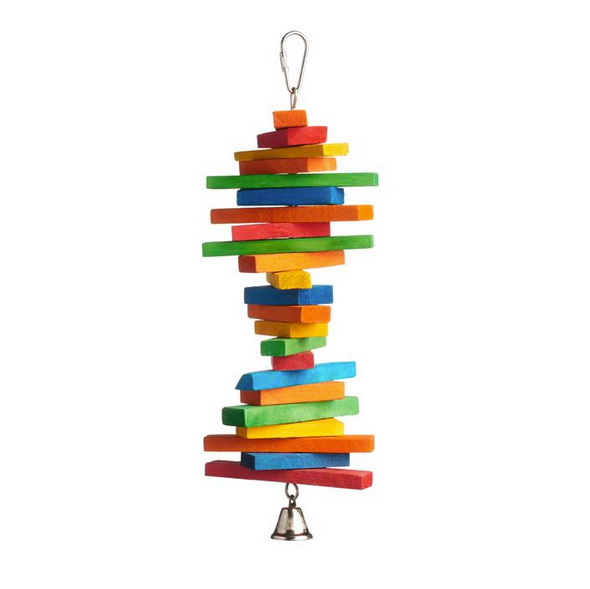Prevue Hendryx™ Bodacious Bites® Akimbo Bird Toy 60953 will provide hours of foot and beak exercise as your bird pulls, chomps and grips a variety of shapes and textures. Designed to provide mental and physical stimulation, Bodacious Bites Akimbo is made from solid hardwood and features a bird safe bell. All materials are 100% safe, made with food grade coloring and quick-link attachments letting you easily connect toy to cage. Our bird toys are handmade and actual measurements may vary slightly. As always, supervise birds at play. Our Bodacious Bites Akimbo bird toy is approximately 4 1/4" long, 1 1/4" wide and 12" high, ideal for Small and Medium birds.