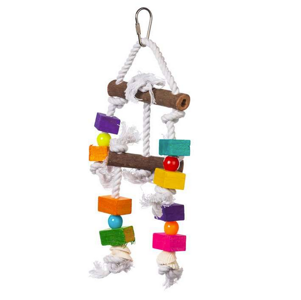 Prevue Hendryx™ Bodacious Bites Buffet are an ideal beak exercise toy comprised of solid natural hardwood strung together with cotton rope or leather strips. Additional materials include leather shapes, plastic beads, sea shells and knotted ropes. These toys are finished with 100% safe FD&C colors and attach with quick-links. Intended for small to medium sized birds. Toy measures 4” wide and 12” long.