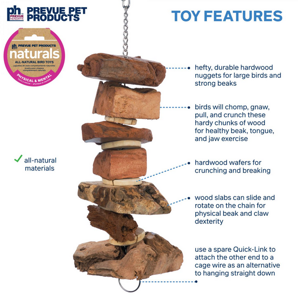 - Birds will chomp, gnaw, pull and crunch these hard chunks of wood for healthy beak, tongue and jaw exercise.